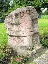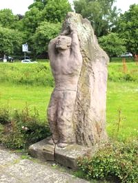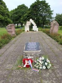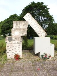 Die Gedenkstätte besteht aus mehreren Teilen: Einer schrägen Bodenplatte mit Inschrift, dahinter links und rechts jeweils eine Skulptur und am Ende eine Betoninstallation