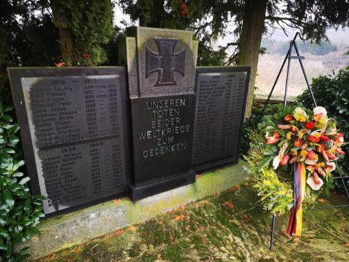 Zwei Gedenkplatten, dazwischen ein Deutsches Kreuz, darunter eine Inschrift