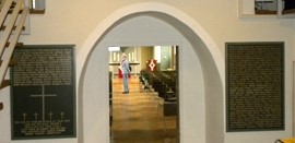 In der Kirche zwei Gedenktafeln mit den Namen der 42 und 106 Kriegstoten der beiden Weltkriege.