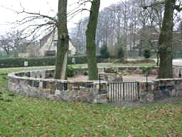 An der Innenseite einer halbhohen kreisförmigen Natursteinmauer mit Eisentür 16 in 3er bzw. 4er Gruppen angeordnete Sandsteinkreuze