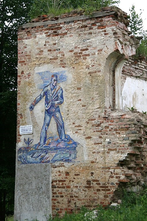 An der Rückwand des teilweise zerstörten Kirchenschiffs hat sich das Kriegerdenkmal für die Gefallenen des Ersten Weltkriegs teilweise erhalten.