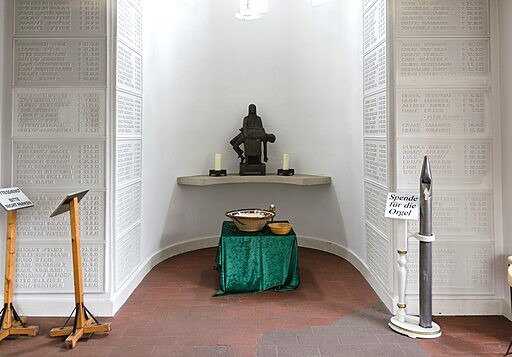 Im Erdgeschoß des Kirchturms (der gleichzeitig der Eingangsbereich ist) befindet sich links eine kleine Kapelle, deren vordere Ecken übereinander zahlreiche