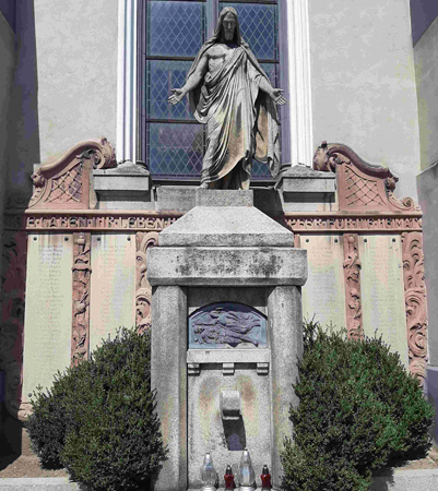 An der Wand vier stark verzierte Namensflächen. Davor eine verzierte niedrige Stele mit krönender, segnender Jesus-Figur.
