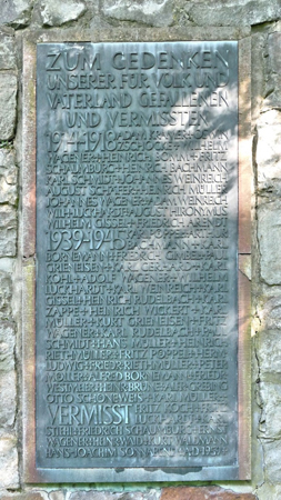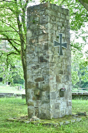 Aus bearbeiteten Natursteinen gemauerte eckige Steinsäule mit einem Deutschen Kreuz, sowie einer Gedenkplatte.