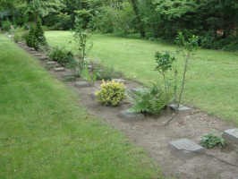 Kirchhof Sankt Simeon und Sankt Lukas: Eine langgestreckte Anlage, an deren einer Stirnseite ein Kreuz mit Inschrift steht.