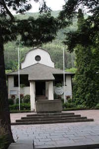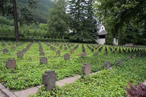 Soldatenfriedhof am Rande der Stadt. In der Mitte eine Gedenkkapelle, vor der Kapelle Steinquader in Form eines Sarkophags, vorne Tafeln für verdienstvolle Mitarbeiter,
