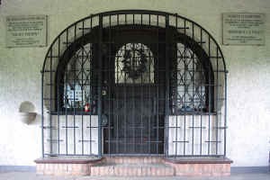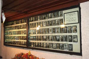 Hinter der Kapelle im Durchgang Gedenktafel mit Fotos für die Opfer der Stadt Brixen, links und rechts der Kapelle Steinkreuze mit jeweils zwei Namen (Erster Weltkrieg).