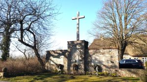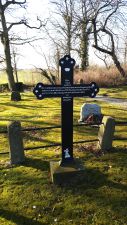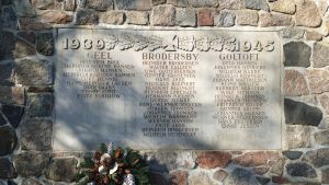 Auf dem Kirchhof unter einem hohen Kreuz an einer Mauer die Namen der 30 und 43 Kriegsopfer beider Weltkriege aus Geel, Brodersby und Goltoft.