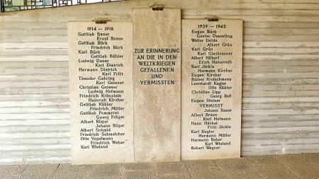 Wandtafeln aus Kalkstein in der Aussegnungshalle auf dem Friedhof mit den Namen der Gefallenen und Vermissten beider Weltkriege.