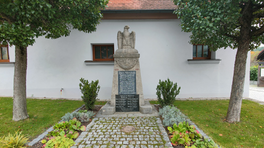 Denkmal mit krönendem Adler vor der Freiwilligen Feuerwehr.