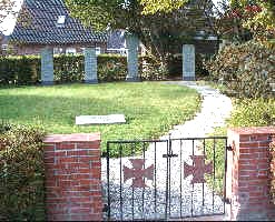 Mittig auf dem Rasen liegt davor eine Steinplatte mit Inschrift.