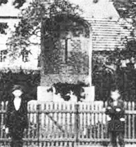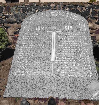 Rest eines Denkmals für die Gefallenen des 1. Weltkriegs, abgelegt neben dem alten Glockenturm vor der Kirchhofmauer.