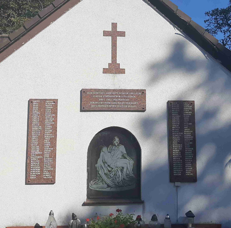 Denkmal für die Gefallenen der Weltkriege an der Außenwand des Totenhauses auf dem Friedhof neben der Kirche.