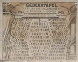 Gedenkblatt für die Gefallenen des Ersten Weltkriegs aus der Parochie Chrzumczütz mit Gorrek, Folwark, Neuhammer, Dometzko, Zlattnik und Chrzowitz.