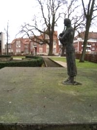 Ein liegender Soldat mit Helm wirkt wie auf einem Tisch aufgebahrt. Die Figur ist mittig in einem in die Erde versenkten Kreis platziert.