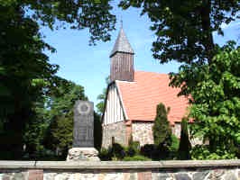 Auf dem Friedhof der Kirche: Stele aus grauem Stein auf Feldsteinsockel.