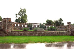 In der Nähe des alten Gutshauses in die Feldsteinmauer integriert: Ein großes halbkreisförmiges Denkmal aus Feldsteinen und rotem Klinker, Wandtafeln für die Gefallenen
