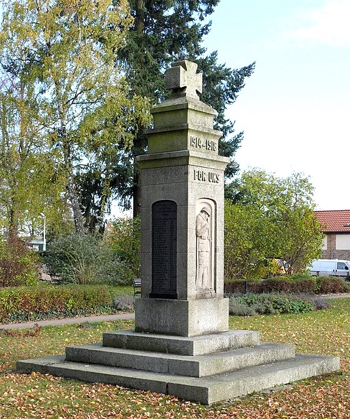 Vor dem Friedhof eine steinerne Stele mit Eisernem Kreuz auf der Spitze. Inschrift vorderseitig, darunter das Relief eines trauernden Soldaten.