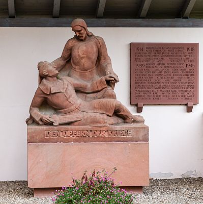 Steinquader, darauf eine Sterbeszene. An der Wand dahinter eine Gedenkplatte.