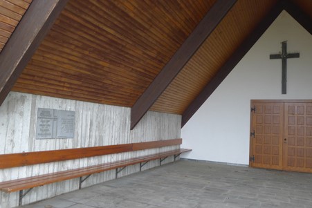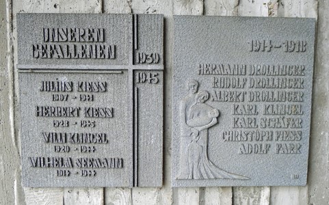 Zwei steinerne Gedenktafeln mit den Namen der Gefallenen der beiden Weltkriege sind an einer Wand der