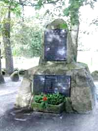 In einer kleinen Anlage ein Findling auf Natursteinsockel, darauf eine Platte zum Gedenken der Kriegstoten des Ersten Weltkrieges.