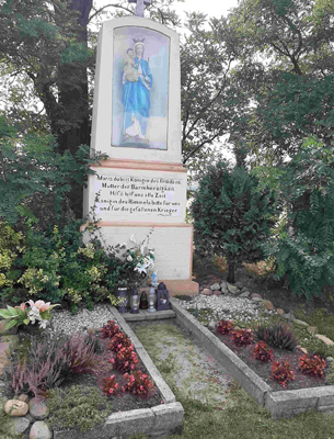 Abgestufte Stele mit krönendem Schaukasten mit einer Marienfigur. Die Namen der Gefallenen befinden sich ganz unten am Sockel.