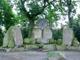 Ehrenmal für beide Weltkriege: Gestaltete Ansammlung aus verschieden großen Findlingen, darauf die Namen der Kriegstoten beider Weltkriege.