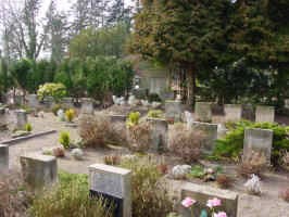 Eine von einer Hecke von dem übrigen Friedhof abgetrennte Grabanlage für Gefallene des Zweiten Weltkrieges.