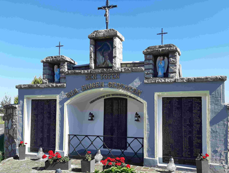 Abgestufte Wand mit Vertiefung in der die Namenstafel des 1. Weltkriegs hängt.