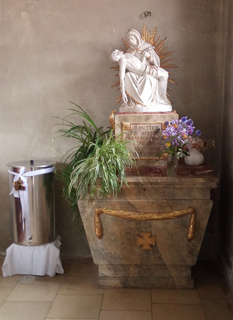 Altar mit Gedenkinschrift in der Kirche ohne Namen.