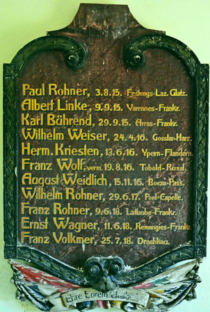 Gedenktafel für die Gefallenen des 1. Weltkrieges aus Droschkau. Die Tafel hängt am Eingang der Kirche St. Barbara.