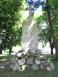 Neben der Kirche befindlich, den Socke umrahmt mit kleineren Findlingen, ein ca. zwei Meter großer Gedenkstein mit steinernem Kreuz.