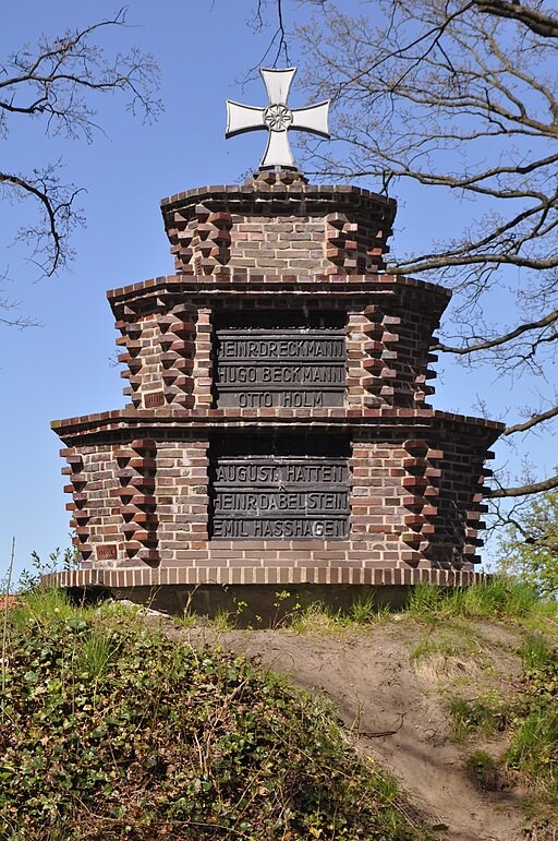 Kriegerdenkmal Erster Weltkrieg: Duvenstedter Damm (gegenüber Haus Nr.42), entw. von Oberbaurat Wilh. Klupp. Ein Klinkermonument mit Keramikkreuz und Namenstafeln