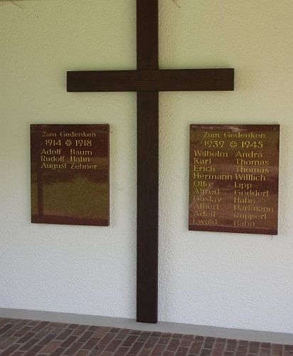 In der Friedhofskapelle befindet sich ein Holzkreuz mit zwei Gedenktafeln.