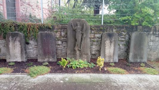 In der Mitte eine Steinplatte mit einer Figur, daneben insgesamt vier Namensplatten (ohne Daten).