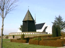 Auf dem alten Kirchhof von Eken auf einer Anhöhe der hölzerne Glockenturm, umgeben von einer Mauer, in der für die 66 Kriegstoten des Ersten Weltkrieges