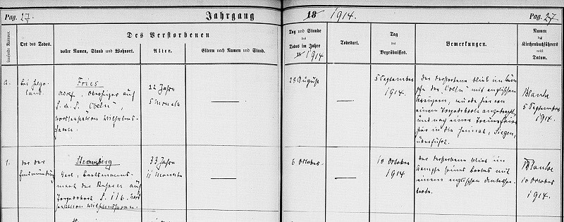 | Musketier | FLOHR | Karl Heinrich Christian | 27J 3M | 29.08.1915 Res-Laz Emden |