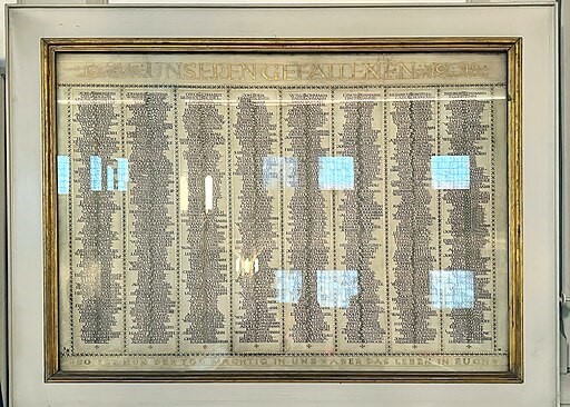 Hinter Glas eine gerahmte Schrifttafel mit den Namen der Gefallenen des Ersten Weltkrieges.