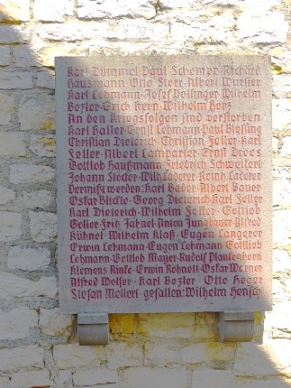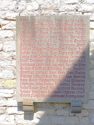 Gedenktafeln für die Gefallenen, die Vermissten und die an den Kriegsfolgen Verstorbenen der Gemeinde Erkenbrechtsweiler auf dem alten Friedhof.