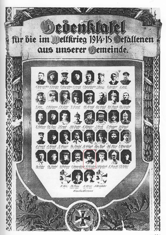 Gedenktafel mit Namen und Fotos der Gefallenen des Ersten Weltkrieges.