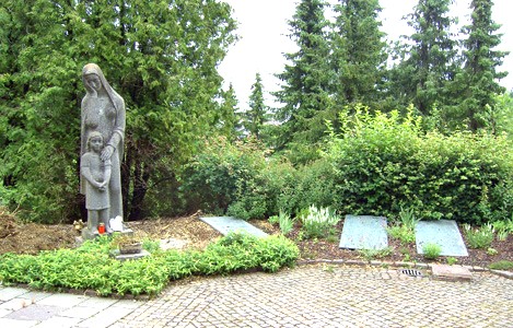 Friedhof. Denkmal als Halbkreis angelegt, Frau mit Kind, Steinplatte mit Inschrift,