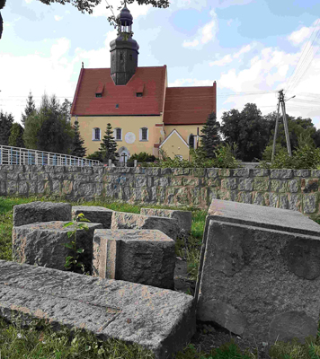 Reste eines Denkmals für die Gefallenen des 1. Weltkriegs am Ufer der Pilawa gegenüber der Kirche. Hohe schmale viereckige Stele.