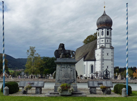 Vor dem Friedhof Ehrenmal mit dem Bayerischen Löwen mit Schild. Die Namen der Kriegstoten beider Weltkriege wiederholen sich hier auf zwei Gedenktafeln. Sie sind nahezu identisch mit denen in der Kirche. Sofern bei den Namen unterschiedliche Schreibweise, sind beide Formen angegeben.