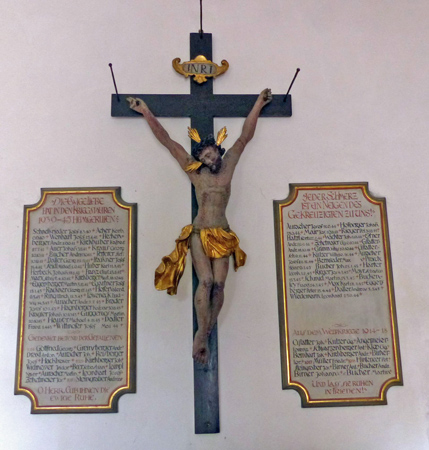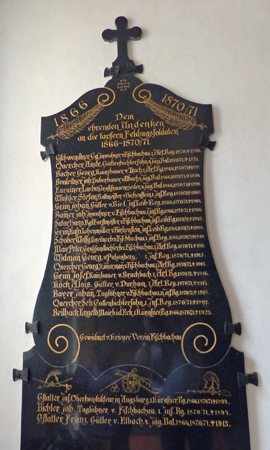 In der Kirche eine schwarze Gedenktafel mit weißer Inschrift für die Feldzüge 1866 – 1870/71 sowie zwei weitere Tafeln mit den Namen der Gefallenen beider Weltkriege.