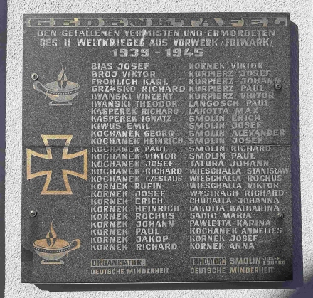 Gedenktafeln für Kriegsopfer des 2. Weltkriegs an einem Kapellenturm im Nordosten des Dorfes.