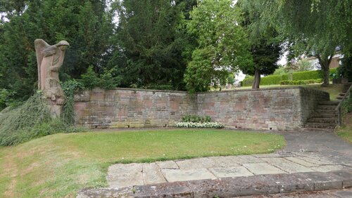 Rechtwinklige Mauer, mit einer Engelsfigur.