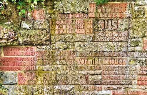 In die Mauer sind Jahreszahlen sowie Namen eingefügt.