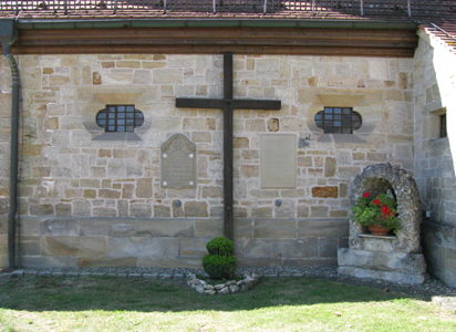 Zwei steinerne Gedenktafeln an der Außenwand der katholischen Kapelle St. Wendelin.
