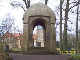 Ehrenmal in Ortsmitte: Auf vier Säulen gemauerte Kuppel, um das Denkmal Tafeln mit Opfern des Zweiten Weltkrieges.