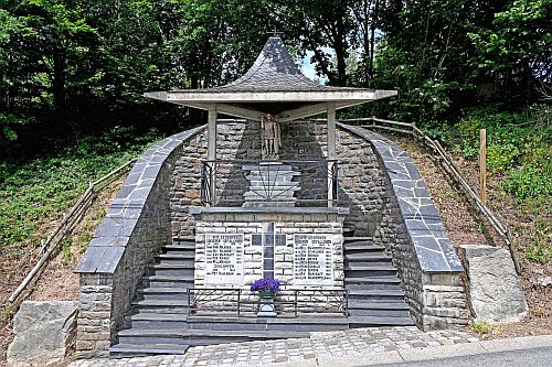 Kriegerdenkmal, zwei Gedenkplatten an einer Natursteinmauer. Oben auf einer Erhöhung eine Engelsfigur, diese ist durch Stufen ereichbar.